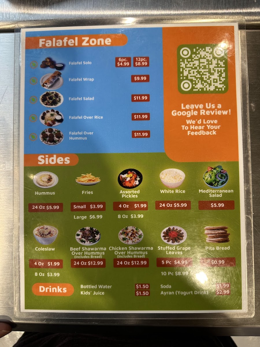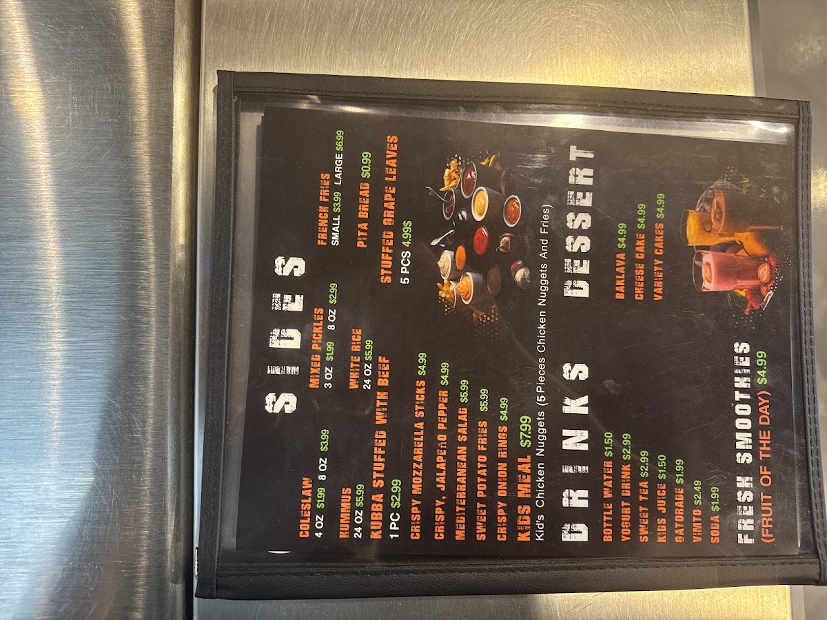 The menu also features enticing sides like crispy French fries, smoked basmati rice, and a refreshing Mediterranean salad. Not to be overlooked are the loaded fries, generously topped with cheese and your choice of protein, making for an indulgent treat.